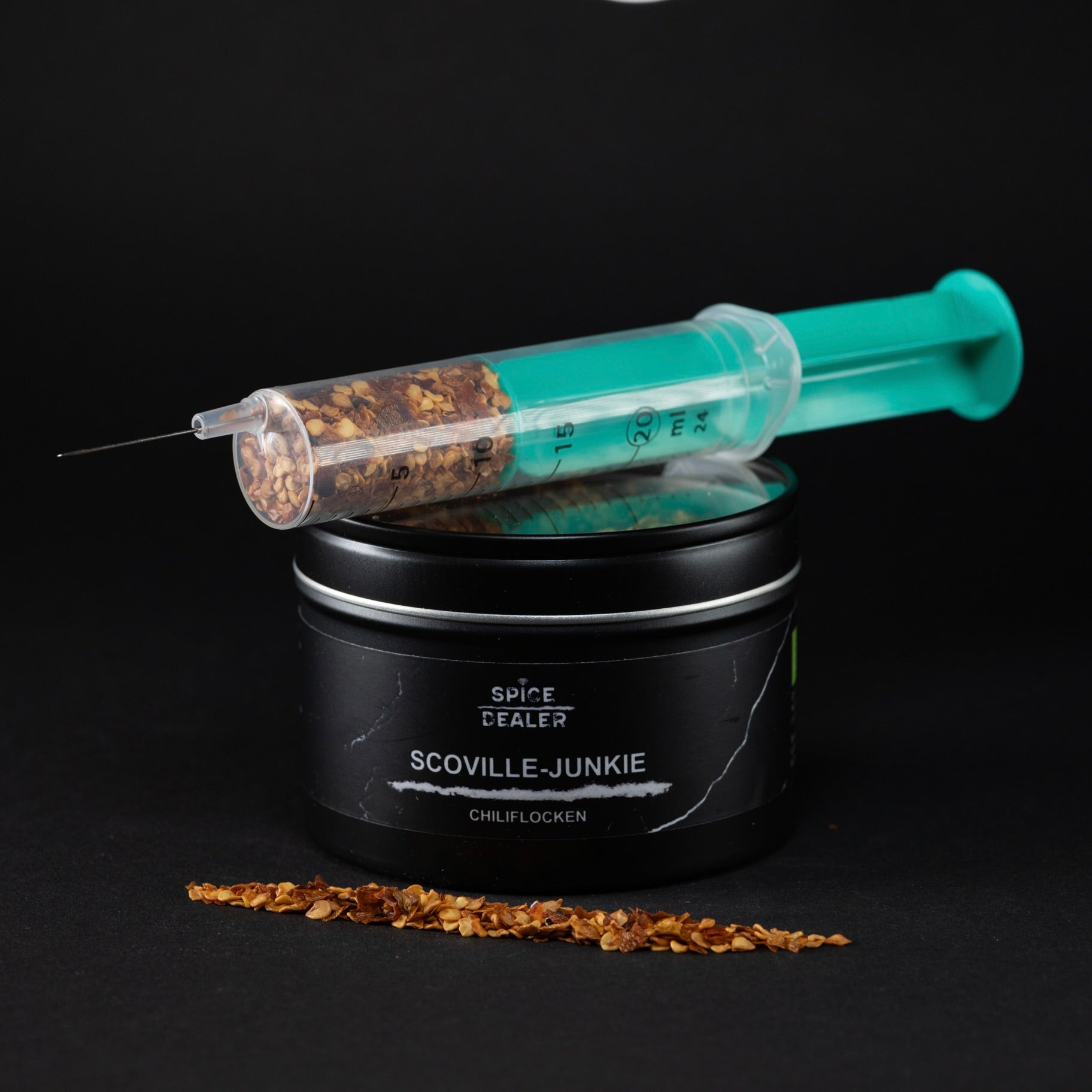Du suchst den Kick? Unsere Bio Chiliflocken, der SCOVILLE-JUNKIE ist der reinste Deal für Schärfe-Junkies. Handgemacht in der SPICE DEALER Bio-Gewürzmanufaktur, ohne Streckmittel, ohne künstliche Zusätze – nur 100 % purer Bio-Chili.
