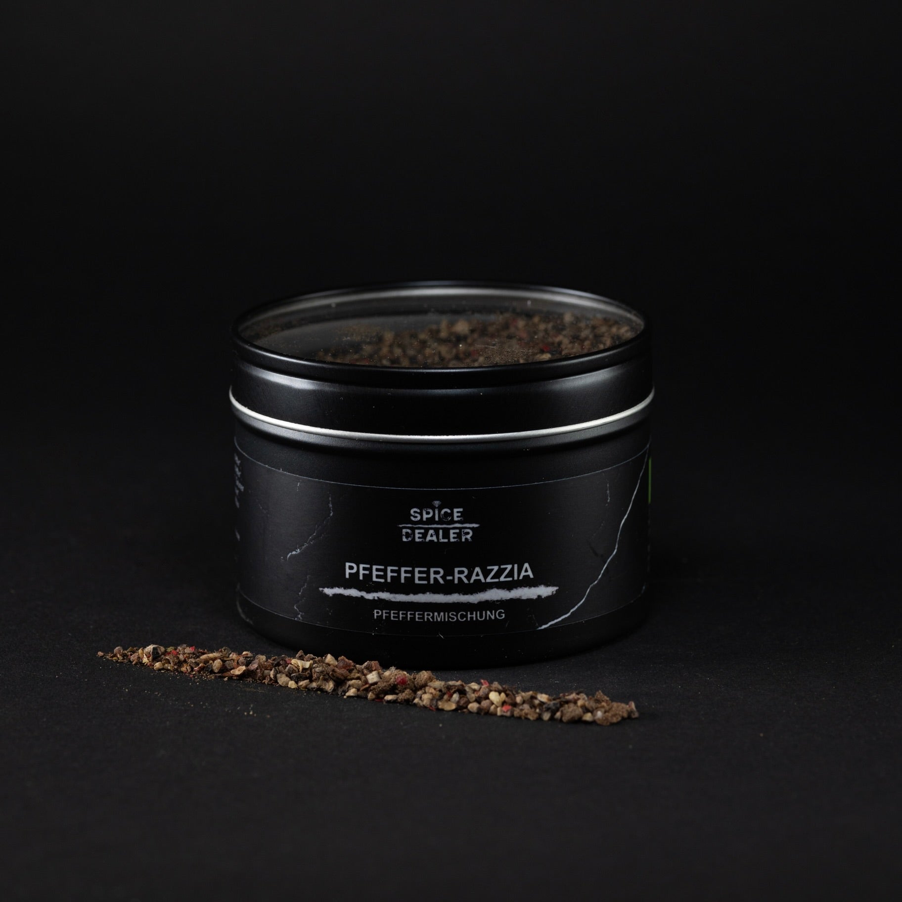 Vergiss normalen Pfeffer. Mit der SPICE DEALER Bio Pfeffermischung, der PFEFFER-RAZZIA ballerst du dir eine siebenfache Geschmacksexplosion auf den Teller. Handgemacht, Bio, ohne Zusatzstoffe – 100 % reine Pfefferpower aus aller Welt.